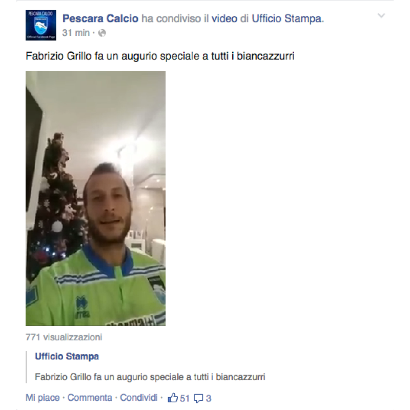 Pescara-Varese sarebbe dovuta essere anche la partita di Fabrizio Grillo. Il terzino sinistro, infatti, con la maglia dei biancorossi ha disputato 76 gare in tre stagioni, prima di passare al Pescara la scorsa estate. Non ci sarà a causa del grave infortunio che lo ha costretto, di fatto, a chiudere anticipatamente la stagione. Grillo ha comunque voluto far sentire la sua voce e la sua vicinanza ai compagni di squadra, nonché augurare un buon Natale a tutti i tifosi biancazzurri, in un video pubblicato dalla pagina Facebook ufficiale della Pescara Calcio (potete vederlo anche sulla nostra pagina profilo): "Volevo augurare un Buon Natale a tutta Pescara. Colgo l'occasione per salutare i miei compagni e fare un in bocca al lupo per la partita contro il Varese. Per me sarebbe stata una partita importante, anzi lo è. Mettetecela tutta, io la maglia l'ho messa (nel video indossa la maglia del Pescara, ndr), non la posso sudare ma tornerò a correre presto. Dimostrate a tutti quello che valete".