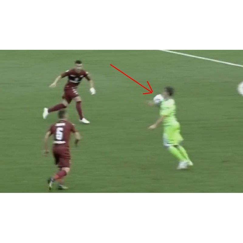 Ho segnato due X rosse; quella piccola indica dove si trova la palla (anche se coperta dal corpo di Pasquato), quella grande indica dove sarebbe dovuta essere in caso di tocco col braccio. E’ proprio questo il punto per comprendere che Pasquato ha colpito il pallone con la spalla; se così non fosse stato, la palla avrebbe avuto una traiettoria diversa (dov'è segnata la X grande). Questo tipo di analisi è stata sostenuta un po’ da tutti gli addetti.