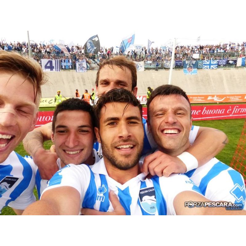 Da ieri pomeriggio sta impazzando sul web il "selfie della vittoria", come è già stato ribattezzato lo scatto di Raffaele Pucino, assieme a Memushaj, Politano, Zuparic e Salamon, con sullo sfondo la Curva pescarese in festa dopo la sfida abruzzese contro il Lanciano vinta per 1-0 con gol di Bjarnason. Tre punti importanti in chiave playoff, ottenuti dopo una settimana in cui la partita, in terra frentata, era stata caricata al massimo sia per voglia di rivalsa verso quella che è da sempre la regina d'Abruzzo, sia per contestare Marco Baroni, ex tecnico proprio del Lanciano. Il Pescara, con una prova d'orgoglio nonostante la prestazione non esaltante, ha portato a casa una vittoria che, dopo quanto già descritto, ha valore e soddisfazione doppie. A fine gara quindi la gioia dei calciatori biancazzurri è esplosa assieme a quella dei 1300 pescaresi presenti e Pucino, 'rubando' la fotocamera al nostro fotografo Graziano Di Nicola ha deciso di scattarsi questo selfie che è ormai diventato virale. Un piccolo pezzetto di ForzaPescara.COM in questa importantissima vittoria.