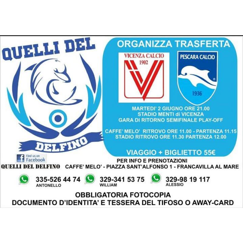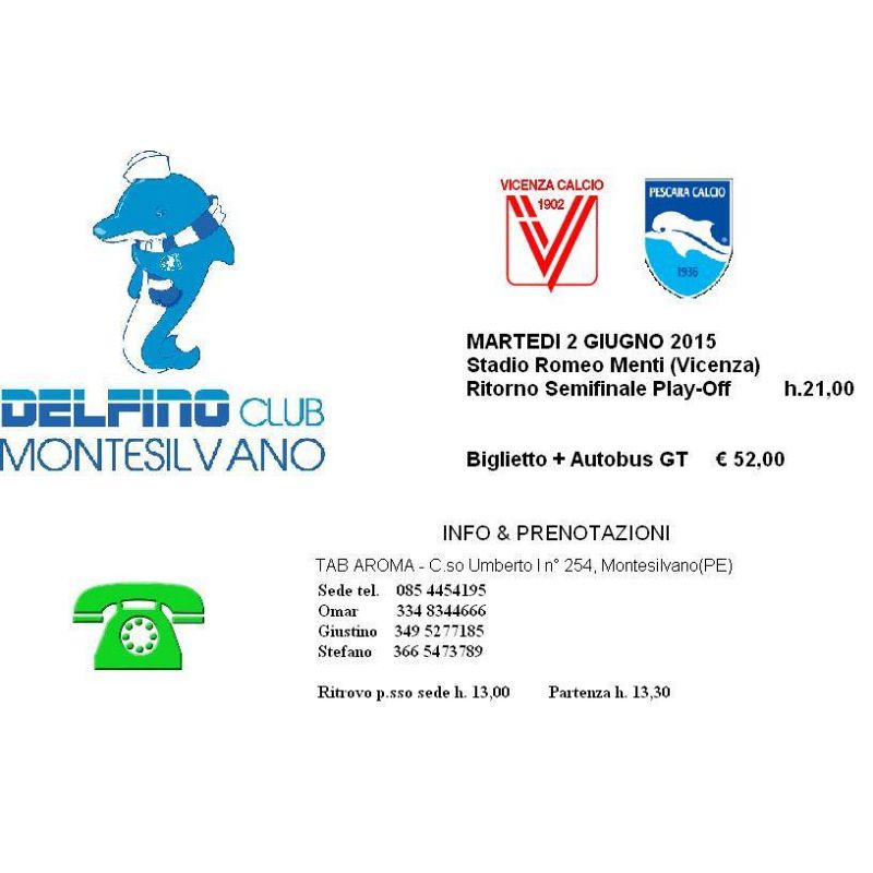 I biglietti per i settori locali sono esauriti da tempo (ho parlato con la Società del Vicenza Mercoledì mattina). Per il Settore Ospiti Biglietti solo a Pescara con TDT/Away. Noi partiamo da Milano ma siamo già full