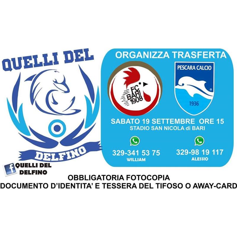 Sono in vendita da oggi i biglietti per la trasferta di Bari. Saranno 1290 i tagliandi a disposizione, acquistabili presso tutte le rivendite VivaTicket d'Abruzzo (a Pescara, CopyBet, Largo Madonna dei Sette Dolori), circuito che permette anche di acquistare e stampare il biglietto direttamente da casa. Il costo è di 14,50 €. Non è prevista la formula "porta un amico allo stadio".