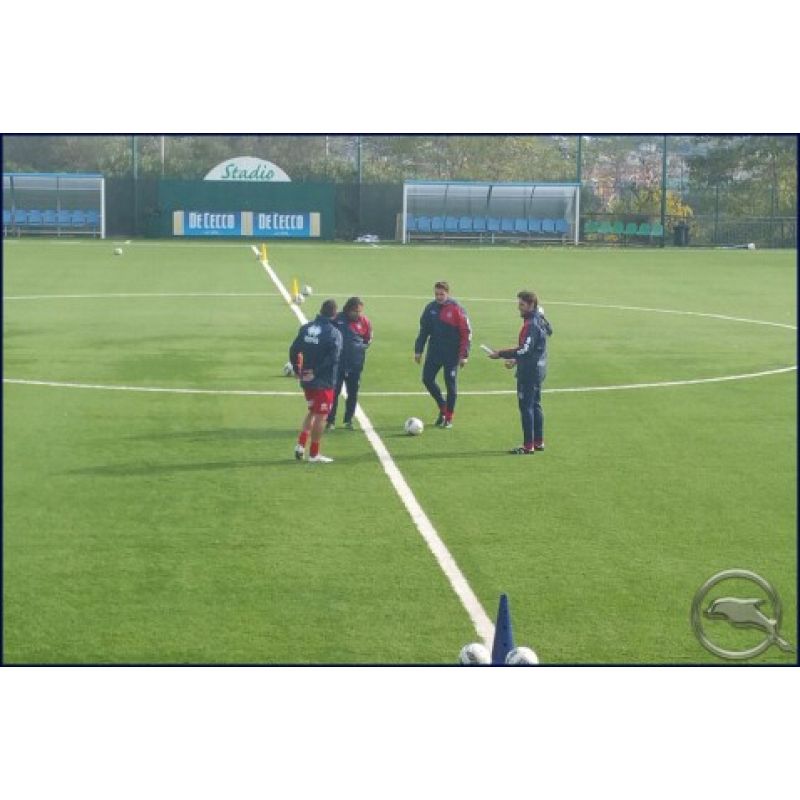 A parte Campagnaro (personalizzato) mentre Crescenzi è sempre più vicino al reinserimento in gruppo. Prima del rientro negli spogliatoi esercizi di scarico. Domani si tornerà a sudare alle ore 15.
