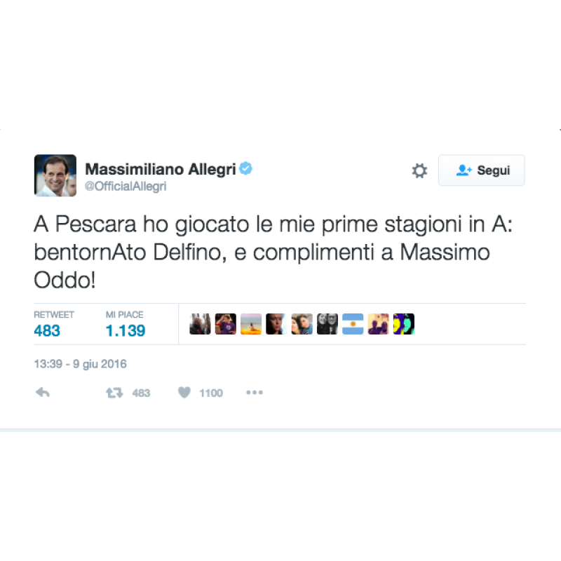 C'è chi quest'emozione l'ha già vissuta, come Marco Verratti: "Complimenti a tutti...sono felicissimo per voi...la città di PESCARA merita la serie A", ha scritto il regista del PSG complimentandosi anche con Massimo Oddo. Altro ex, e campione d'Italia, è Massimiliano Allegri, che in biancazzurro ha giocato quattro stagioni: "A Pescara ho giocato le mie prime stagioni in A: bentonAto Delfino, e complimenti a Massimo Oddo!", ha scritto su twitter.