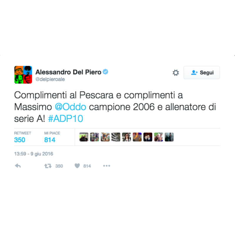 C'è anche chi questa maglia non l'ha mai indossata, ma ha deciso di dedicare un pensiero ad un compagno con cui ha alzato il trofeo più importante della carriera di un calciatore, la Coppa del Mondo. Alessandro Del Piero, ex calciatore della Juventus, sempre su twitter ha scritto: "Complimenti al Pescara e complimenti a Massimo Oddo campione 2006 e allenatore di serie A!".