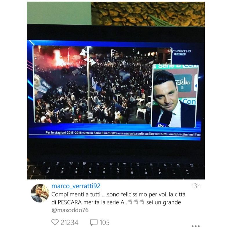 E non finisce qui. Martorella, Brugman, biancazzurri in prestito come Pigliacelli e Mignanelli, tantissimi hanno dedicato un pensiero alla promozione del Pescara. E poi ci sono le società: Sampdoria, Genoa e Milan, squadra con cui Oddo ha vinto tutto, si sono complimentate col Pescara. Così come l'ex AD, e socio, Danilo Iannascoli che su Facebook ha scritto: "Un sogno che si è avverato! 6 promozioni in serie A che per fortuna ho potuto viverle tutte fattivamente. Queste ultime due promozioni ottenute con sacrifici davvero enormi, ma bisognava assolutamente riportare la nostra città ed i nostri impagabili tifosi nel grande calcio e cancellare quella maledetta traversa di Bologna dell'anno scorso.