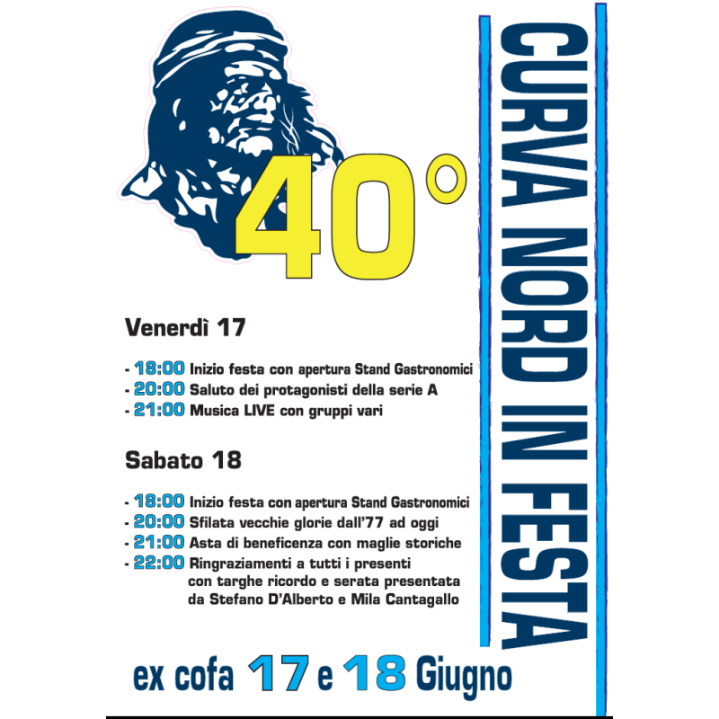 Per salutare al meglio la serie A e i 40 anni dei Pescara Rangers, ben due giorni di festa con la partecipazione di vecchie glorie e protagonisti dell'ultima promozione in serie A. Questo quanto organizzato dalla tifoseria organizzata biancazzurra in occasione del quarantennale della fondazione, in programma venerdì 17 e sabato 18 nell'area Ex Cofa. Ad animare la serata anche stand gastronomici, musica e tanto divertimento. In alto il programma completo.