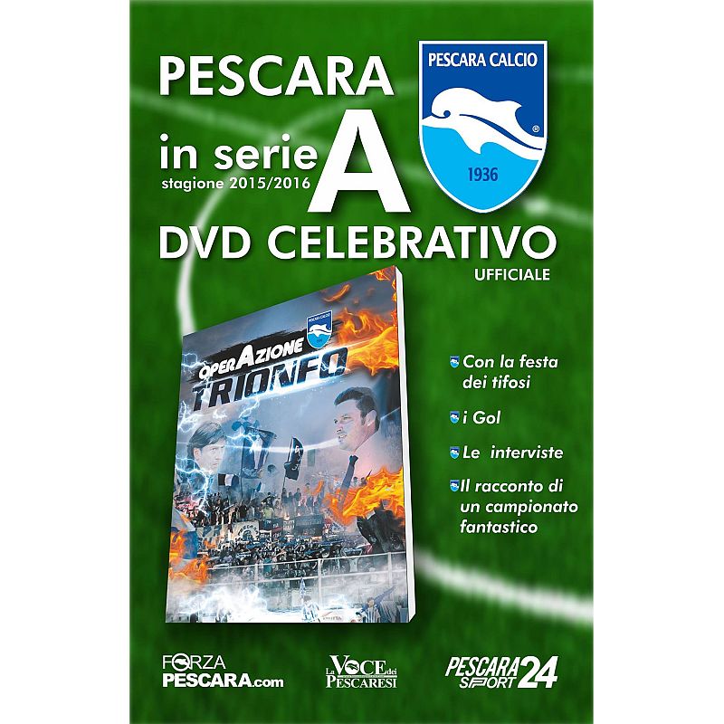 Finalmente ci siamo! Il DVD OperAzione Trionfo dedicato alla promozione del Pescara in serie A è finalmente in vendita! I gol, le immagini, la festa, le interviste: tutto all'interno di questo grande lavoro, possibile solo grazie alla collaborazione delle diverse testate che hanno partecipato. Dietro, infatti, ci sono le redazioni di ForzaPescara.com, di PescaraSport 24 e de La Voce dei Pescaresi che si sono unite in un'unica coproduzione per offrire alla città un ricordo indelebile di questa fantastica annata!