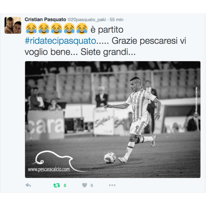 "È partito #ridatecipasquato - scrive l'attaccante sul suo profilo Twitter - grazie pescaresi vi voglio bene...siete grandi...". E chissà se le strade di Pasquato e del Pescara non torneranno ad incrociarsi entro la fine del mercato.