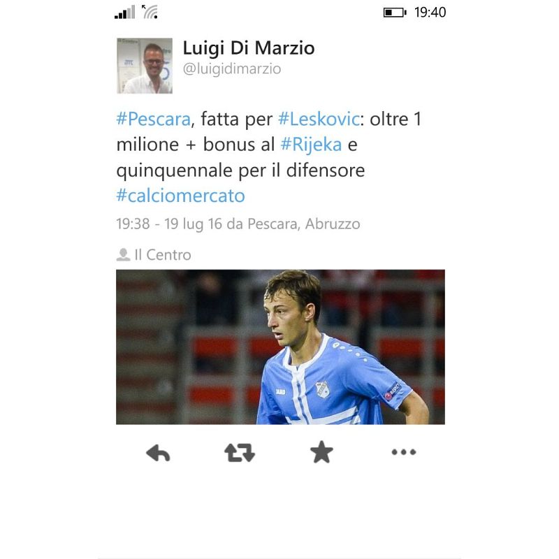 È fatta per Marko Leskovic a Pescara. Il difensore croato classe '91 firmerà un contratto di cinque anni, mentre al Rijeka, proprietario del cartellino, andrà un milione di euro più bonus. A riportare la notizia è il collega del quotidiano Il Centro Luigi Di Marzio.