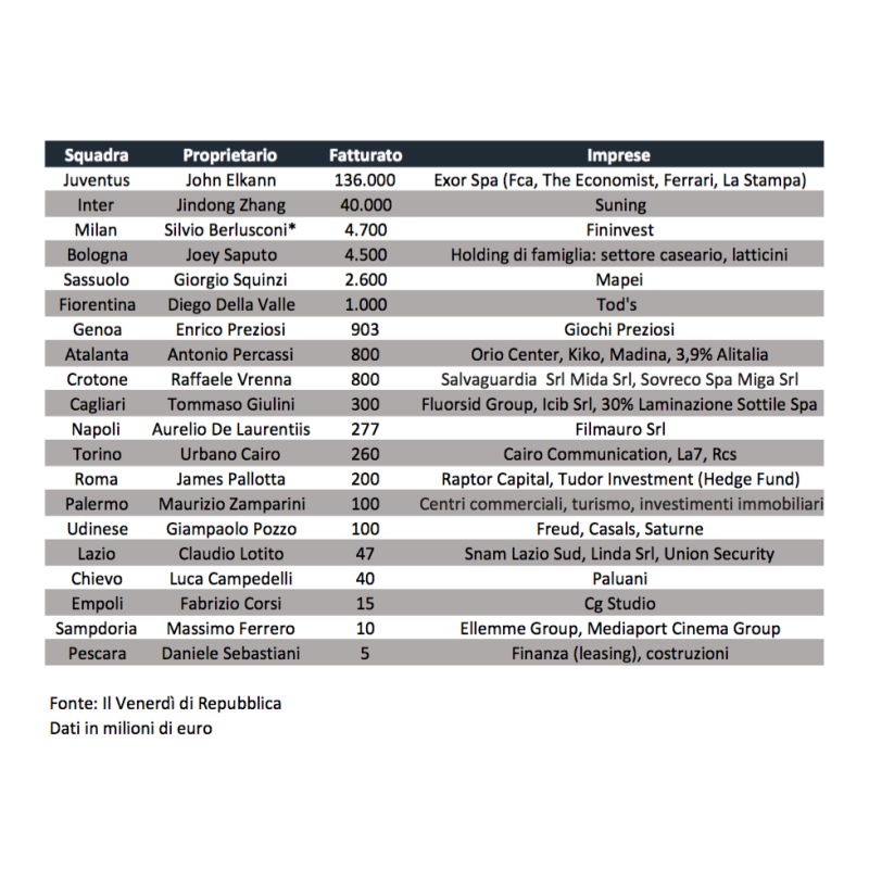 Il Venerdì di Repubblica ha pubblicato un'interessante classifica che analizza i fatturati dei proprietari delle diverse società di calcio di Serie A. Attenzione: non i fatturati delle società, bensì dei presidenti e patron che guidano le società. John Elkann, proprietario della Juventus (il presidente è Andrea Agnelli), domina incontrastato con i ricavi di Exor. Dietro c'è la nuova proprietà dell'Inter che a breve dovrebbe rivaleggiare con quella del Milan, proprio oggi diventata a marchio cinese. Dietro alle tre grandi, ci sono Joey Saputo (Bologna) e Giorgio Squinzi (Sassuolo). E via via scendendo più in basso, con differenze che diventano sempre più marcate.