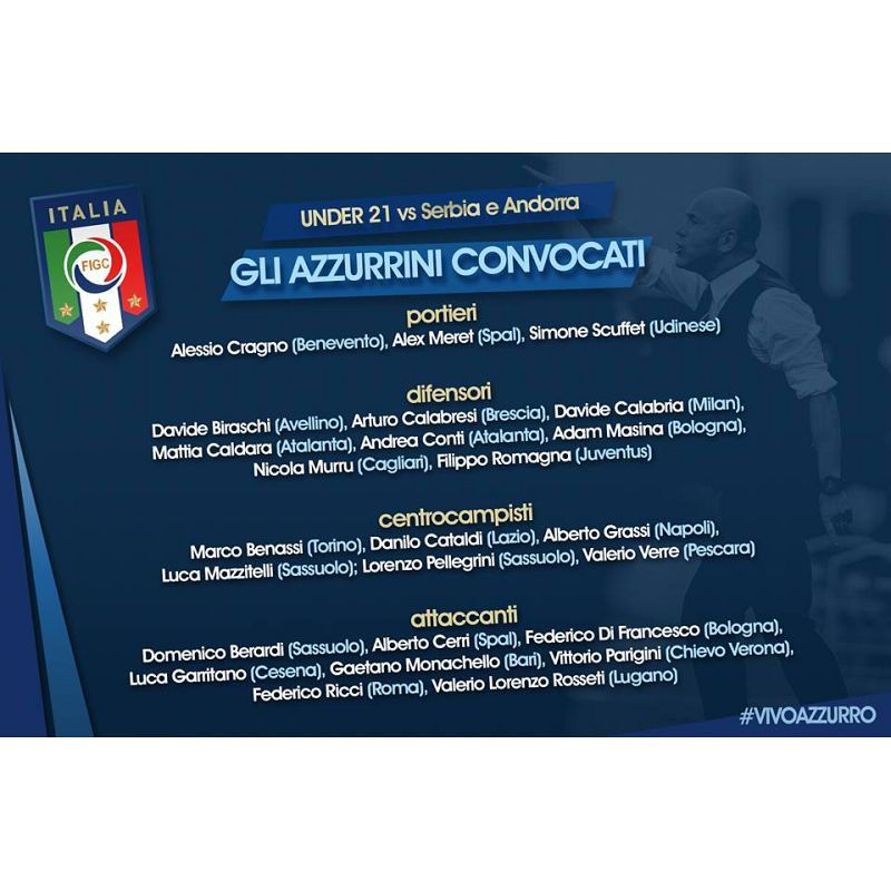 Difensori: Davide Biraschi (Avellino), Arturo Calabresi (Brescia), Davide Calabria (Milan), Mattia Caldara (Atalanta), Andrea Conti (Atalanta), Adam Masina (Bologna), Nicola Murru (Cagliari), Filippo Romagna (Juventus);