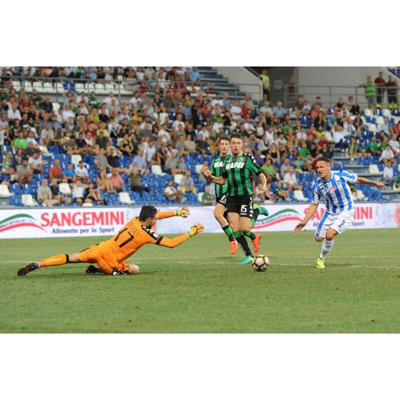 SECONDO TEMPO - Seconda frazione meno veemente da parte del Delfino che, forse, come nella gara contro il Napoli paga la grande intensità del primo tempo. Il Sassuolo prende campo e comincia a spingere, non prima di un'altra occasione del Pescara con Biraghi che trova ancora Consigli attento. Al 67' arriva il raddoppio del Sassuolo. Brugman perde un pallone banale proprio davanti la sua area, la difesa biancazzurra respinge un primo tentativo ma poi Berardi con un gran sinistro da fuori trafigge Bizzarri. La partita sembra indirizzata. Oddo si affida al francese Bahebeck, al debutto, all'albanese Manaj e al romeno Mitrita. È proprio il piccolo esterno a suonare la carica e all'80', dopo aver tenuto in modo elegante in campo una palla destinata in fallo laterale, è bravissimo a penetrare in area e a trovare tutto solo Manaj che segna senza difficoltà il gol del 2-1. Quello che succede pochi minuti dopo ha dell'incredibile. Una palla lunga permette a Manaj di trovarsi tutto solo davanti a Consigli con la difesa neroverde tagliata fuori. Sembra fatta, ma l'ultimo controllo è difettoso e l'attaccante albanese si allunga troppo il pallone che diventa facile preda dell'ex portiere dell'Atalanta. Un'occasione clamorosa che avrebbe potuto portare il risultato sul 2-2. Il Pescara comunque non demorde e al 91' trova un'altra grande occasione con Zampano che trova ancora Consigli a negargli la gioia del primo gol in Serie A. È l'ultima possibilità di riequilibrare la partita, dopo cinque minuti di recupero Tagliavento fischia la fine di una gara che il Pescara ha giocato ancora una volta bene e con tanta personalità , ma peccando anche di ingenuità che a questi livelli si pagano a caro prezzo.