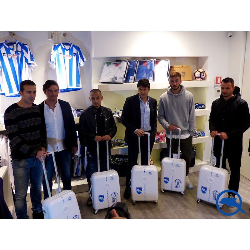 Serata dedicata allo sponsor Cocco Pelletterie di Sulmona, che allo store ufficiale di via Regina Margherita ha consegnato dei trolley da viaggio alla squadra rappresentata da Campagnaro, Mitrita, Pepe e Cristante.