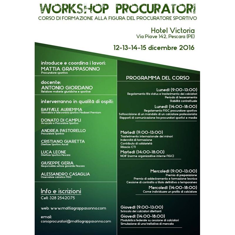 Luca Leone (D.S. Pescara) e Giuseppe Geria (Responsabile settore giovanile del Pescara) tra i docenti. Introduce e coordina il procuratore Mattia Grappasonno.