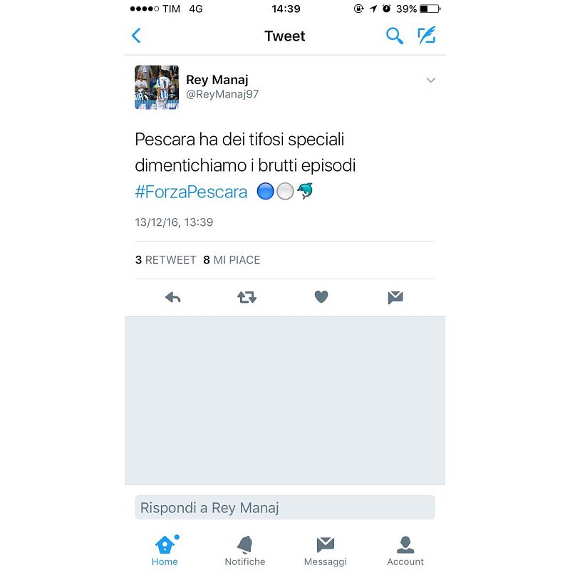 Rey Manaj è tra i giocatori più criticati di questo girone d'andata, non eccezionale, del Pescara. Un ragazzo giovane che, a onor del vero, è stato catapultato in Serie A direttamente dalla Primavera dell'Inter. Dopo la contestazione di due giorni fa, proprio lui ha provato a ricucire i rapporti con un post su Twitter: "Pescara ha dei tifosi speciali, dimentichiamo i brutti episodi #ForzaPescara". E chissà che domenica col Bologna non possa toccare di nuovo a lui.