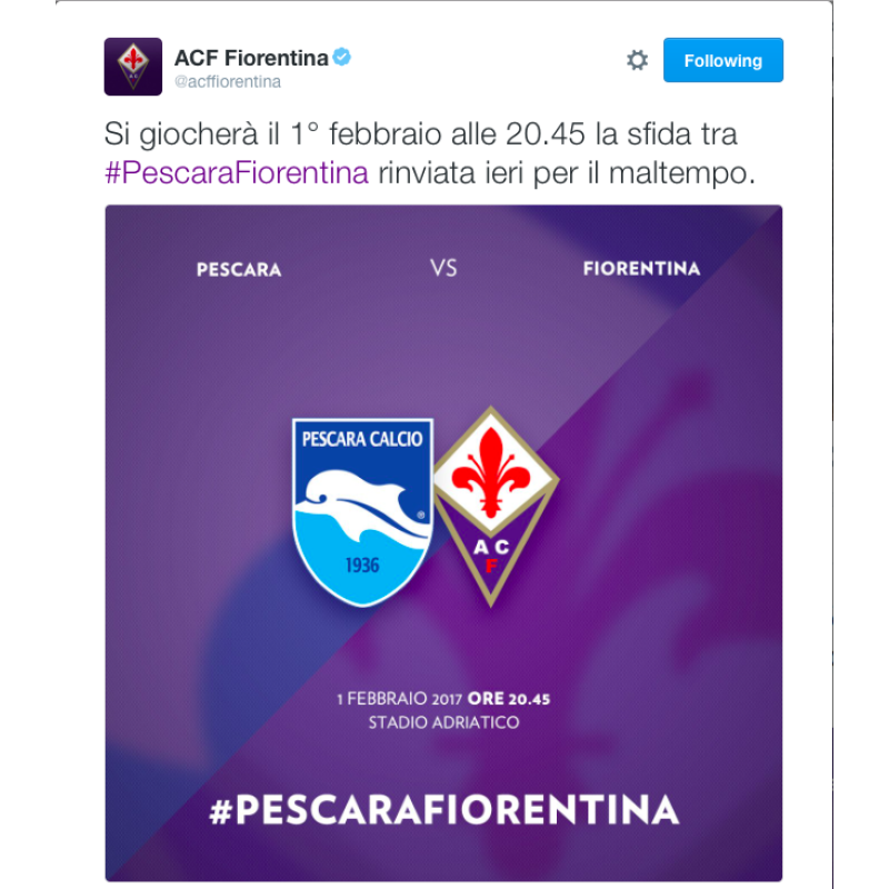 Si recupererà il 1 febbraio 2017, alle ore 20.45, il match tra Pescara e Fiorentina rinviata domenica scorsa a causa delle importanti nevicate che hanno colpito l'Abruzzo. Ecco il tweet ufficiale della società viola e di seguito il comunicato ufficiale della lega serie A.