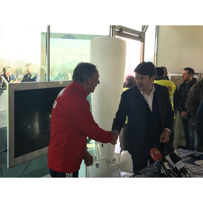 tifoseria. Il presidente biancazzurro, seduto al fianco del nuovo allenatore in
