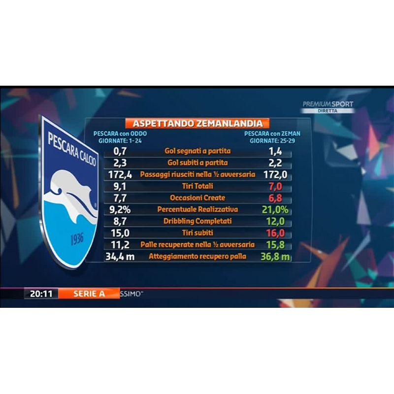 Il Pescara di Massimo Oddo aveva una media realizzativa di 0,7 gol a partita, quello di Zeman 1,4. In questo caso, influiscono sia la differenza nel numero di partite, sia - e soprattutto - i cinque gol segnati al debutto del boemo contro il Genoa. Simile, invece, quello dei gol subiti - 2,3 contro 2,2 - così come il numero dei passaggi riusciti nella metà campo avversaria, che recita una media di 172,4 contro 172. Con Zeman sono diminuiti tiri totali e occasioni create: 9,1 contro 7,0 per quanto riguarda i tiri, 7,7 contro 6,8 per le occasioni. Aumentati i tiri subiti: una media di 16 da quando c'è il boemo contro i 15 dell'era Oddo. È però migliorata la percentuale realizzativa, che anche in questo caso risente dei gol segnati contro il Genoa: 9,2% con Oddo, 21% con Zeman. Sempre a favore dell'ex tecnico della Roma ci sono tre dati: i dribbling completati (12 contro 8,7), le palle recuperate nella metà campo avversaria (15,8 contro 11,2) e, soprattutto, l'atteggiamento nel recupero palla, che porta la squadra a iniziare il pressing a 36,8 metri contro i 34,4, quindi con una squadra più bassa, di Massimo Oddo.