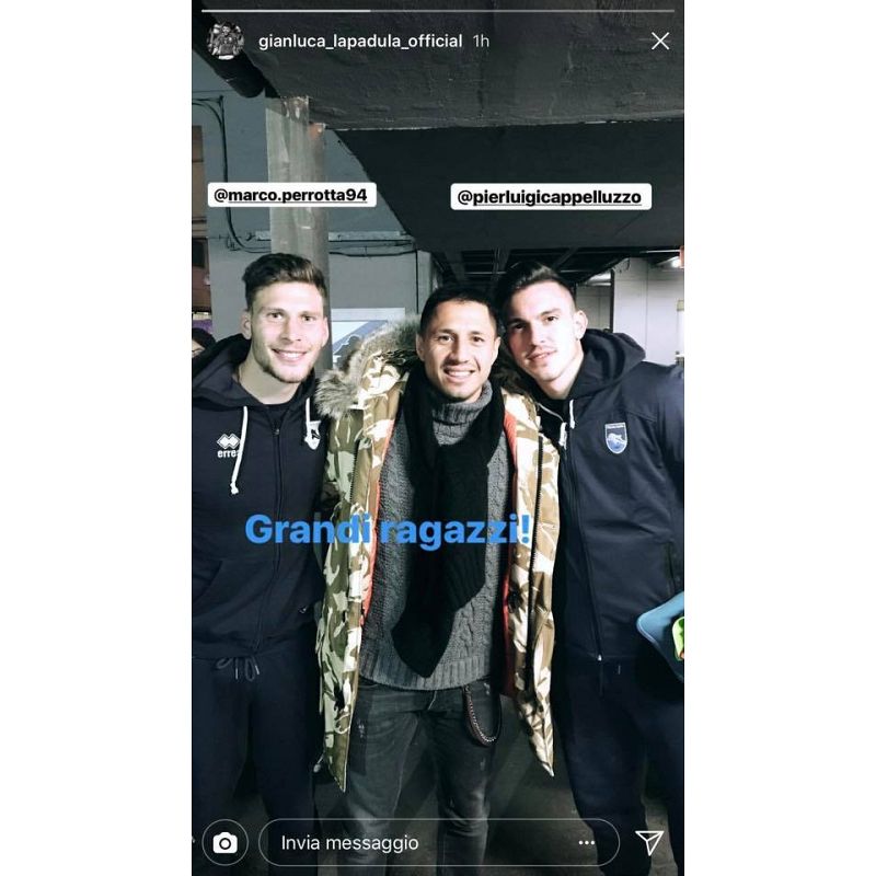 Al termine della gara di Coppa contro la Sampdoria c'è stata una gradita visita. Gianluca Lapadula, attaccante del Genoa ed ex biancazzurro, ha voluto riabbracciare alcuni suoi vecchi compagni, nonché diversi membri dello staff conosciuti nel corso della sua esperienza a Pescara. Il tutto immortalato con una foto su Instagram assieme a Perrotta e Cappelluzzo.Â