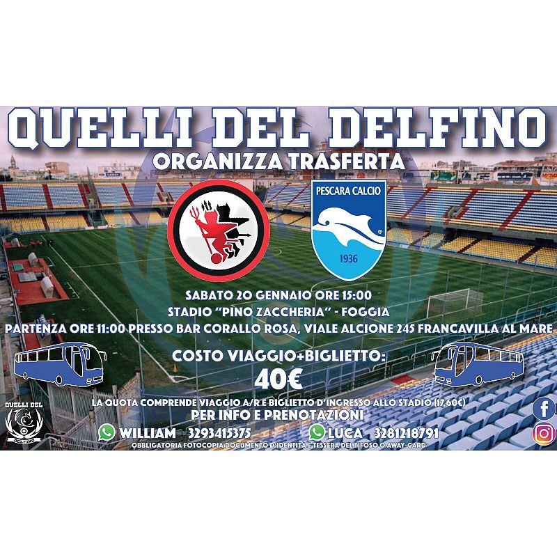 Ci saranno anche i ragazzi del club Quelli del Delfino in trasferta il prossimo 20 gennaio a Foggia per seguire il Delfino nella sua prima trasferta del 2018. Per aggregarsi, il costo, comprensivo di viaggio e biglietto d'ingresso allo Zaccheria, è di 40 euro. La partenza è prevista per sabato 20 gennaio alle 11 da Francavilla al Mare. Per ulteriori dettagli si legga la locandina qui pubblicata.