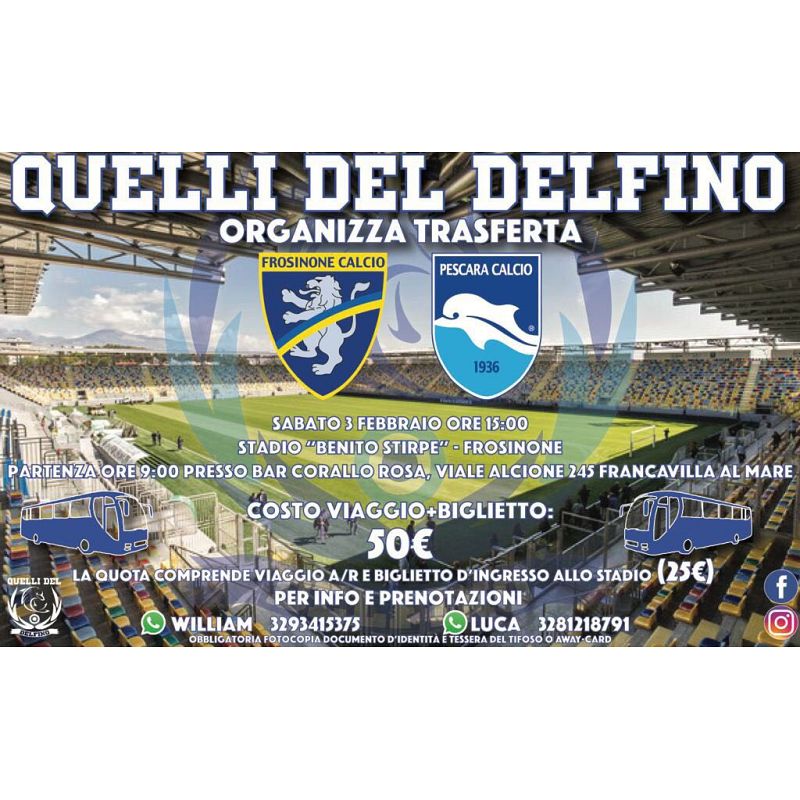 Il gruppo di tifosi Quelli del Delfino organizza la trasferta di sabato 3 febbraio 2018 a Frosinone dove il Pescara giocherà contro i gialloblu al Benito Stirpe. Il costo è di 50 €, comprensivo di viaggio in pullman e biglietto d'ingresso per il settore ospiti. Per ulteriori informazioni, si rimanda alla locandina qui pubblicata.