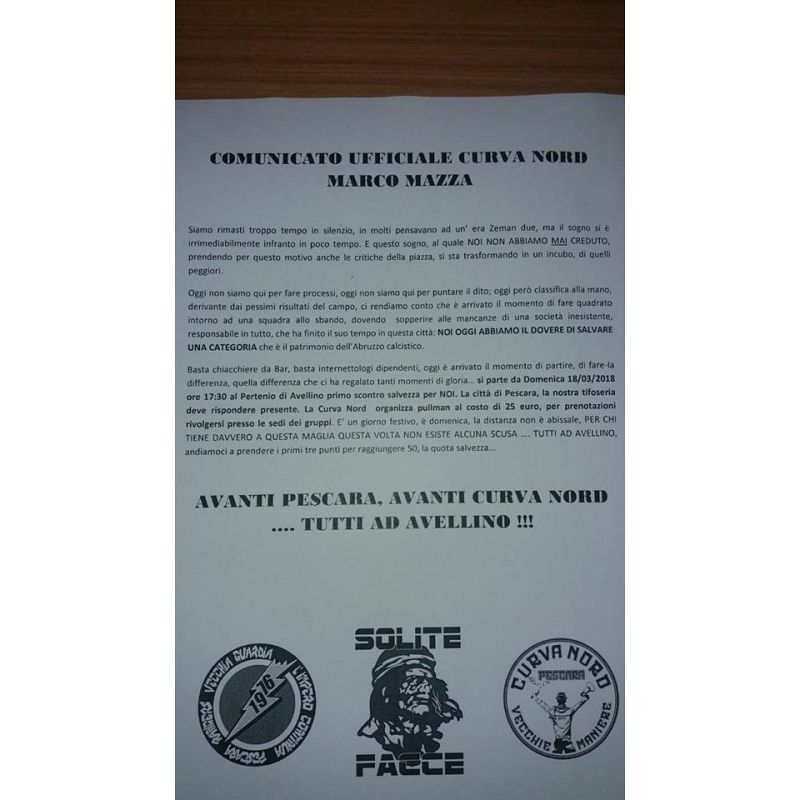 Basta chiacchiere da Bar, basta internettologi dipendenti, oggi è arrivato il momento di partire, di fare la differenza, quella differenza che ci ha regalato tanti momenti di gloria... si parte da Domenica 18/03/2018 ore 17:30 al Partenio di Avellino primo scontro salvezza per NOI. La città di Pescara, la nostra tifoseria deve rispondere presente. La Curva Nord organizza pullman al costo di 25 euro, per prenotazioni rivolgersi presso le sedi dei gruppi. E' un giorno festivo, è domenica, la distanza non è abissale, PER CHI TIENE DAVVERO A QUESTA MAGLIA QUESTA VOLTA NON ESISTE ALCUNA SCUSA... TUTTI AD AVELLINO, andiamoci a prendere i primi tre punti per raggiungere 50, la quota salvezza...