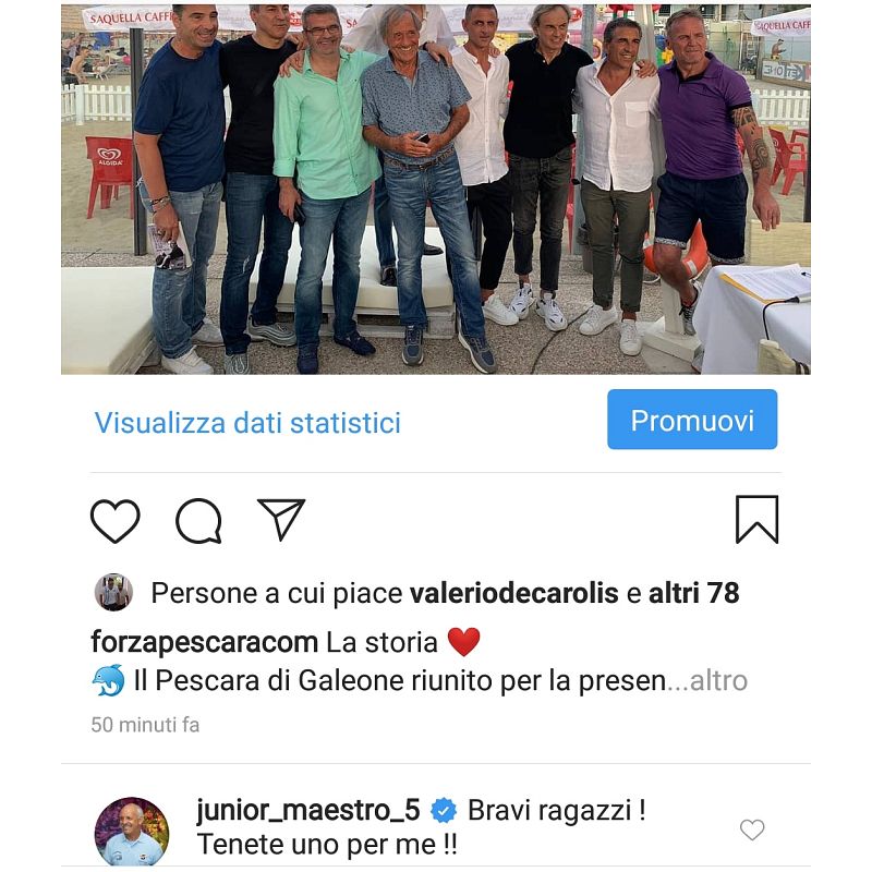 Non era presente ieri alla presentazione del libro "Poveri ma belli" di Lucio Biancatelli, ma ha voluto far sentire comunque la sua vicinanza. Leo Junior, campione indiscusso e protagonista di quegli anni e dei due campionati di Serie A con Galeone, ha commentato sul profilo Instagram di ForzaPescara.com la foto che ritrae il suo vecchio allenatore con i suoi compagni durante l'avventura in riva all'Adriatico. Un commento scherzoso che potete leggere nell'immagine qui allegata. Un modo come un altro per Leo Junior di far sentire la sua presenza in una Pescara che ancora lo ama.Â