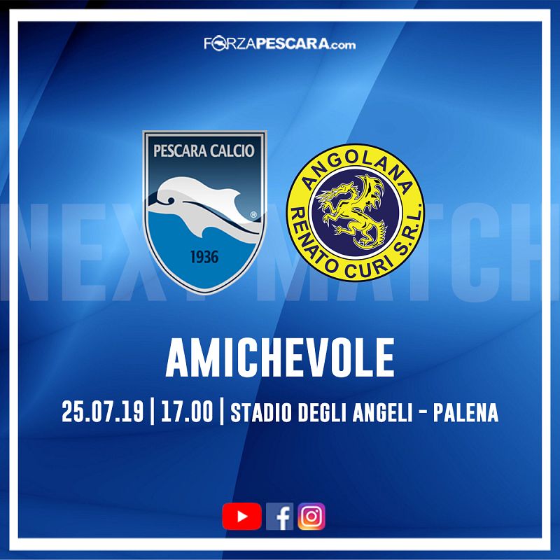Calcio d'inizio fissato per le 17.00 oggi a Palena. In scena Pescara e Renato Curi Angolana, la squadra di Città Sant'Angelo che milita nel campionato di Eccellenza abruzzese, il cui proprietario è Gabriele Bankowski, vice presidente proprio del Delfino. Dopo la vittoria per 8-1 nella prima gara contro il Delfino Flacco Porto di domenica scorsa, i biancazzurri affronteranno i nerazzurri mentre prosegue il lavoro atletico e tattico diretto dal tecnico Luciano Zauri. Interesse anche per il possibile debutto di Luca Palmiero, appena arrivato in prestito dal Napoli.