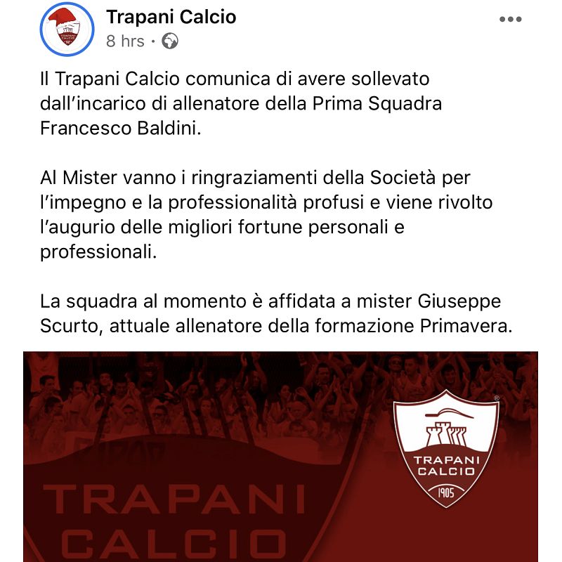 Trapani, esonerato Francesco Baldini