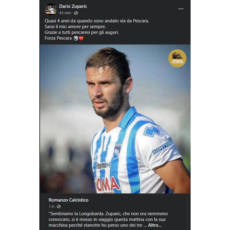 Approfittando di un post pubblicato dalla pagina Facebook "Romanzo calcistico", Zuparic (che oggi gioca con i Portland Timbers negli Stati Uniti) ha voluto ricordare quell'evento, commentando con parole d'amore nei confronti di Pescara e dei pescaresi che gli hanno fatto gli auguri nel giorno del suo compleanno: "Quasi 4 anni da quando sono andato via da Pescara. Sarai il mio amore per sempre. Grazie a tutti pescaresi per gli auguri. Forza Pescara".