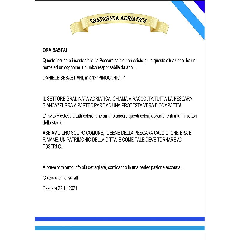 Complimenti ai ragazzi dei distinti. Questo comunicato inoltre è la pietra tombale sui finti ultras della curva Nord che dovrebbero solo nascondersi per la vergogna. Dopo Sebastini il problema di Pescara siete diventati voi.
