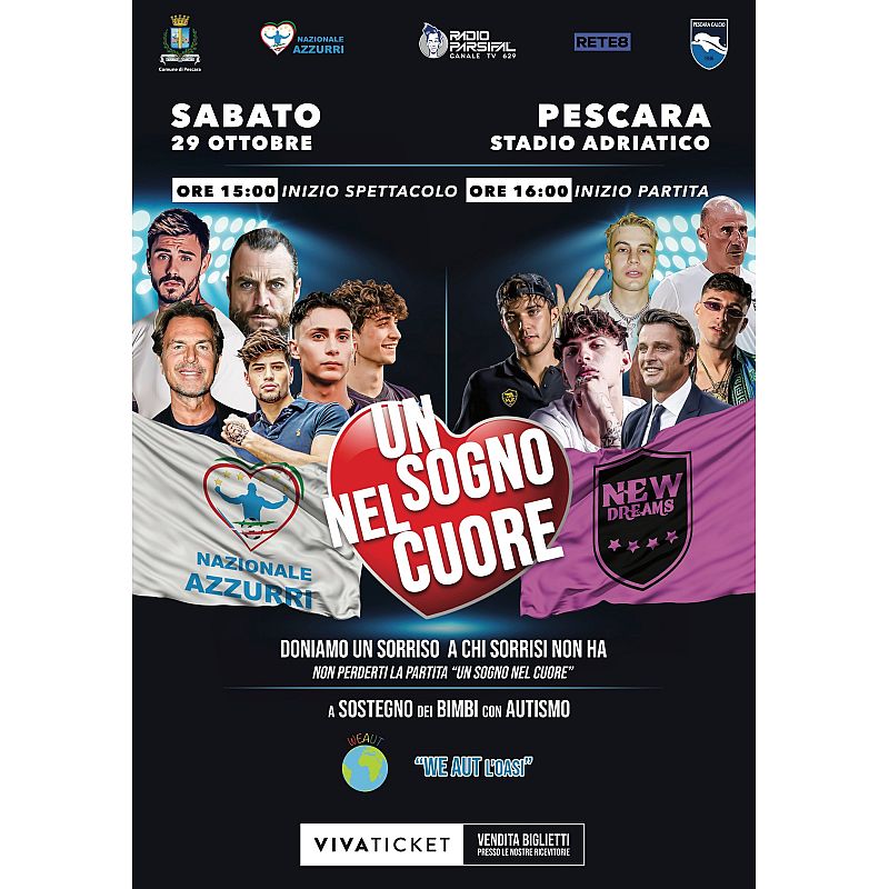 A partire dalle ore 15:00 di domani, sabato 29 ottobre 2022, allo stadio Adriatico Cornacchia la Nazionale Azzurri scende in campo per la solidarietà. L'appuntamento con la partita “Un sogno nel cuore” è alle 15:00 e servirà a sostenere il progetto “We Aut l'oasi” dedicato alla creazione di centri specializzati per bambini autistici. Proprio la Nazionale Azzurri ha organizzato l'evento “sfidando” la New Dreams, dove spiccano diversi volti noti dello spettacolo.