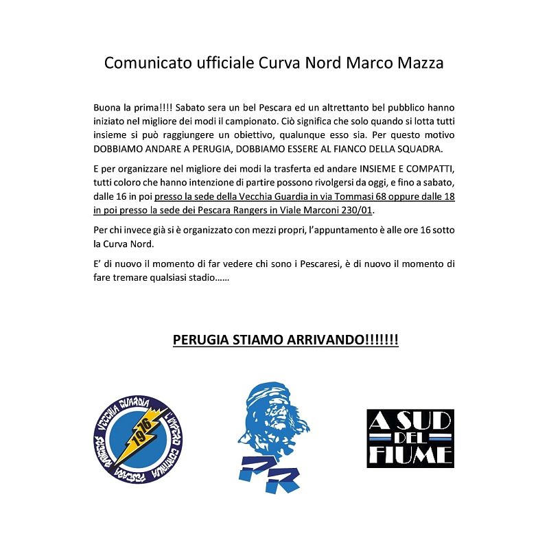E per organizzare nel migliore dei modi la trasferta ed andare INSIEME E COMPATTI, tutti coloro che hanno intenzione di partire possono rivolgersi da oggi, e fino a sabato, dalle 16 in poi presso la sede della Vecchia Guardia in via Tommasi 68 oppure dalle 18 in poi presso la sede dei Pescara Ranger in Viale Marconi 230/01.