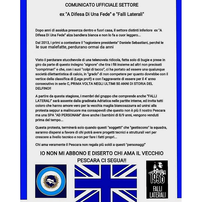 Apartire da questa stagione, imembri del gruppo che comprende anche "FALLI LATERALI" sarà assente dalla gradinata Adriatica nelle partite interne, ed invita tutti coloro che hanno amore vero per la vecchia maglia biancazzurra ad unirsi alla protesta seppur a malincuore ma consapevoli che questo non è più il nostro Pescara ma una SPA "AD PERSONAM" dove anche i bambini di 8/9 anni, vengono venduti prima del tempo...