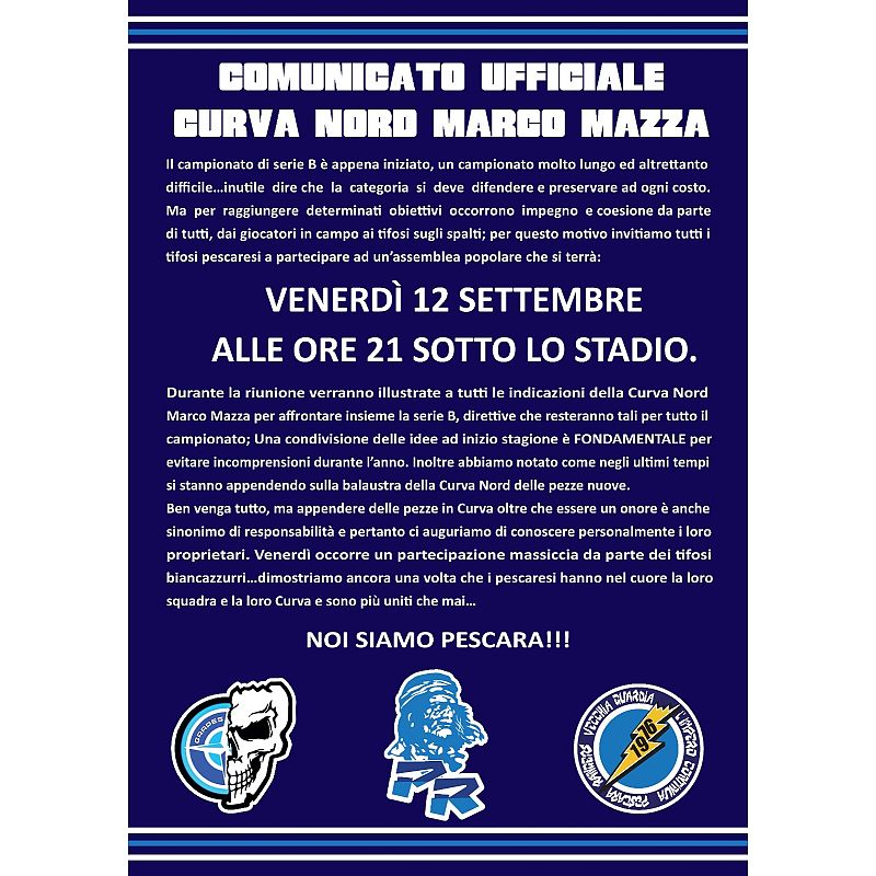 Ma per raggiungere determinati obiettivi occorrono impegno e coesione da parte di tutti, dai giocatori in campo ai tifosi sugli spalti; per questo motivo invitiamo tutti i tifosi pescaresi a partecipare ad un'assemblea popolare che si terrà: