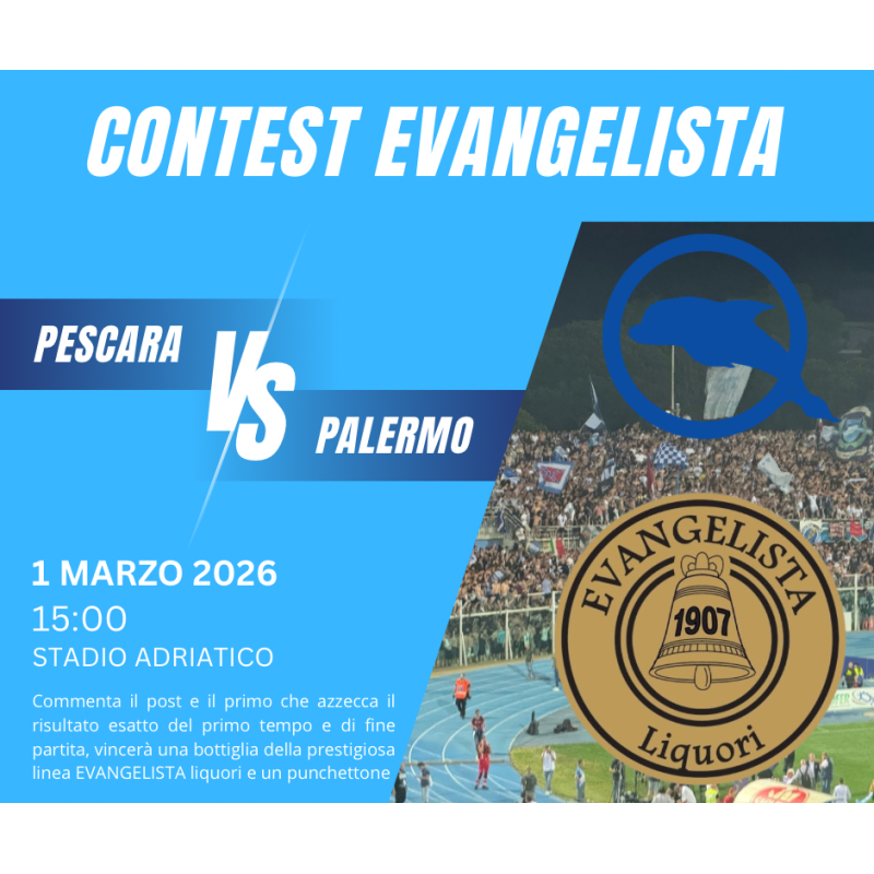 Il gioco del pronostico è di nuovo tra noi. Ogni settimana, in occasione delle partite del Pescara, i lettori potranno partecipare al gioco del pronostico: chi indovinerà esattamente il risultato esatto del primo tempo e quello finale del match riceverà in omaggio una bottiglia della prestigiosa linea EVANGELISTA e un punchettone. Un modo per unire la passione sportiva al gusto autentico della tradizione liquoristica abruzzese.