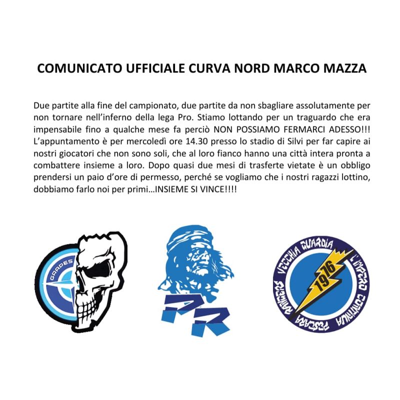 Riportiamo integralmente il comunicato della Curva Nord “Marco Mazza”: Due partite alla fine del campionato, due partite da non sbagliare assolutamente per non tornare nell'inferno della lega Pro. Stiamo lottando per un traguardo che era impensabile fino a qualche mese fa perciò NON POSSIAMO FERMARCI ADESSO!!!