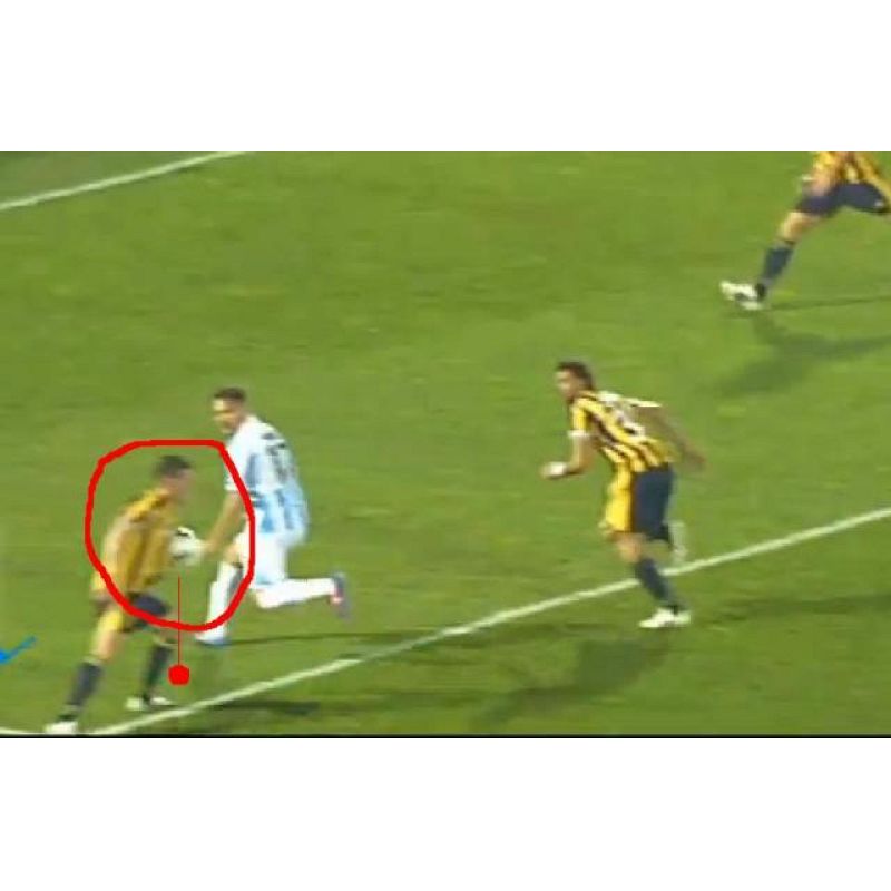 Anche qui decisione corretta dell’arbitro, a tal proposito ho voluto sottolineare in entrambe le immagini la corretta posizione e visuale di Baracani. Nella prima foto è possibile notare come il nostro difensore (presumo essere Zanon ma non ne sono sicuro) tocca la palla cambiandole traiettoria. Nella foto seguente ho voluto segnalare sia la posizione del pallone che ha cambiato traiettoria in modo evidente (rendendo quindi certo il tocco del difensore biancazzurro) sia il seguente contatto tra le due gambe che portano alla caduta del giocatore stabiese.
