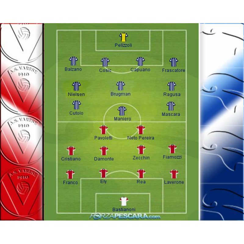 Il Varese gioca con un 4-4-2 molto offensivo che assomiglia più ad un 4-1-3-2 viste le caratteristiche dei giocatori in campo. In porta Bastianoni, difesa con Franco e Laverone terzini, Ely e Rea centrali. Centrocampo, come detto, atipico: Zecchin in cabina di regia (ma bravo ad attaccare), Corti (o Damonte) al suo fianco e due attaccanti sulle corsie laterali come Cristiano (o Flamozzi se non dovesse recuperare) e Calil. In avanti la coppia formata da Neto Pereira e l'ex Lanciano e Sassuolo Pavoletti. Arbitra Riccardo Pinzani di Empoli.