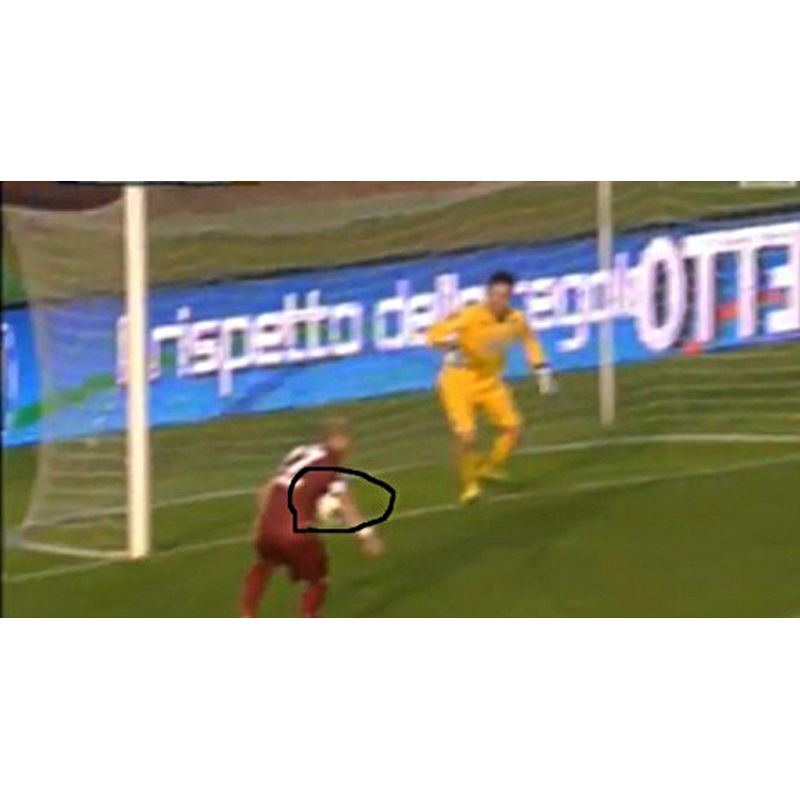 Unico episodio della partita. Coralli, già ammonito, tocca la palla col braccio sistemandosela per il seguente tiro in porta.