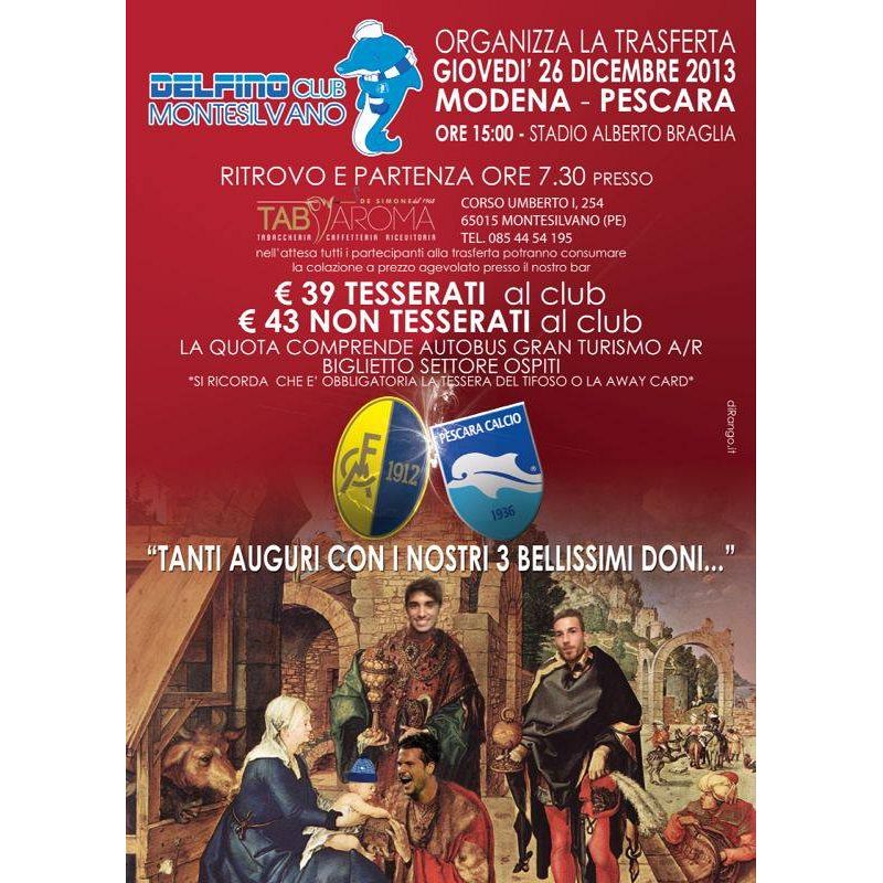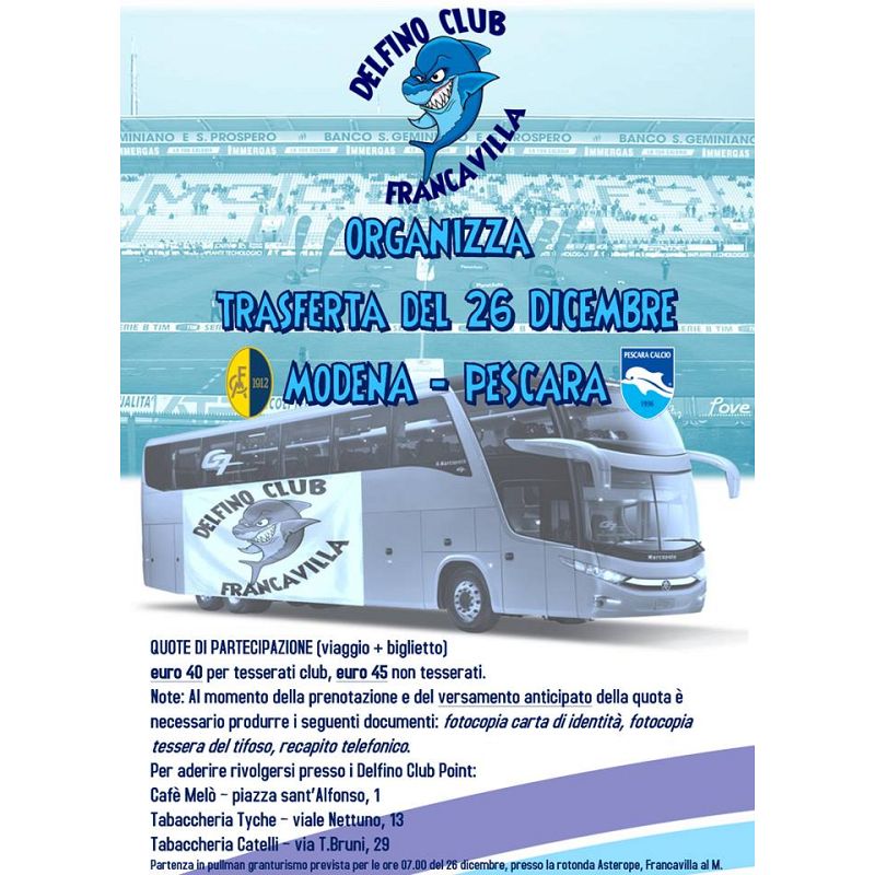 Un'informazione utile a tutti coloro che volessero recarsi a Modena per la trasferta al Braglia del prossimo 26 dicembre. I Delfino Club di Francavilla e Montesilvano stanno organizzando i pullman con relativo biglietto valido per la partita.