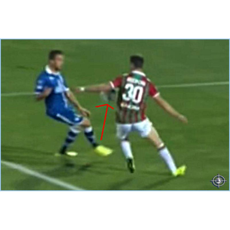 Primo fallo di Farkas su Ragusa. Intervento pericoloso che blocca una azione importante. Giallo solare.