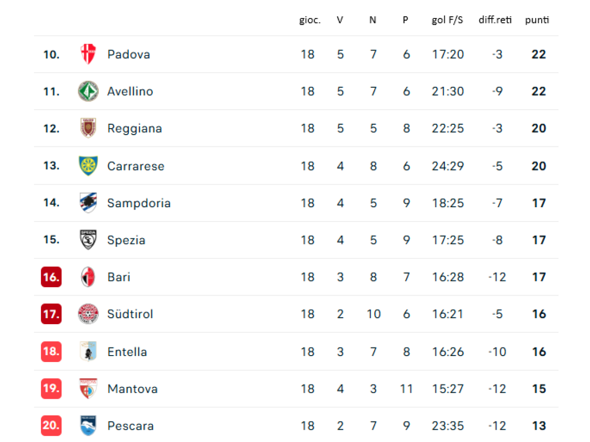A mio avviso, la situazione è complicata ma non è impossibile salvarsi. A chi dice che, per non retrocedere, da qui alla fine del campionato dovremmo vincere 7-8 partite e pareggiarne altrettante, farei notare che abbiamo le stesse vittorie del Sud Tirol (loro hanno tre pareggi in più, prendono pochi gol) e una vittoria in meno di Entella e Bari; il Mantova ha solo un punto più di noi. Abbiamo dimostrato sul campo che queste quattro formazioni non sono più forti del Pescara, e altre squadre potrebbero essere risucchiate. Ora, molto dipende da quello che decide il lucratore...