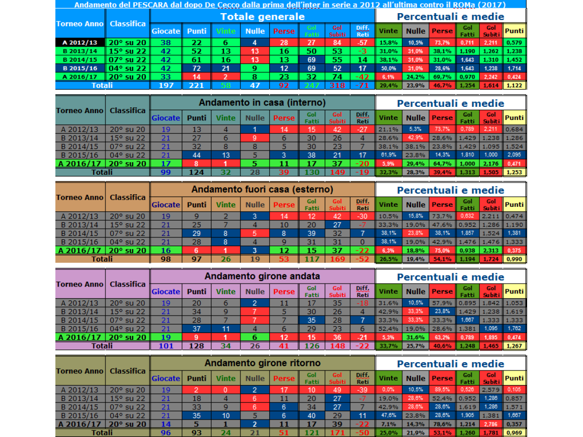 grande gesCtione dal 2012. In ROSSO il maggior negativo ed in BLU il maggior positivo. A breve le statistiche dei record dell\'andamento del PESCARA dal 1936 al 2017